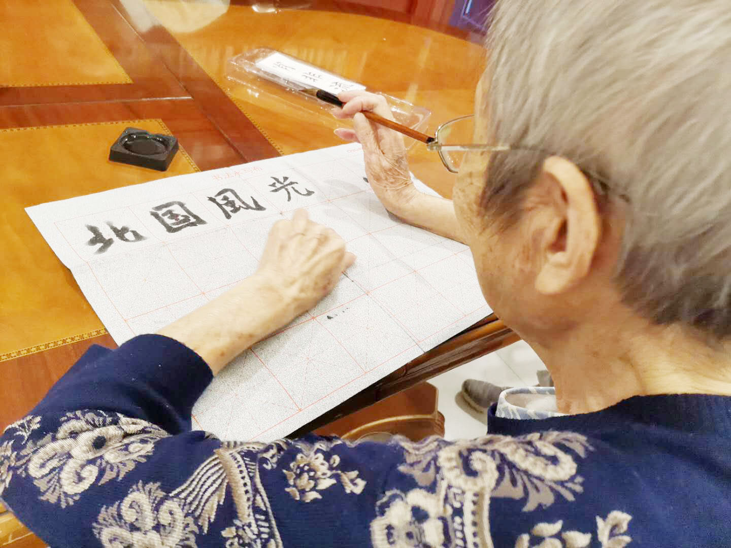奶奶,写得一手好看的毛笔字,在颐养中心里没事就看看报纸,写写毛笔字,爷爷虽然不爱说话,但也是常常陪在奶奶身边看着她写字。
